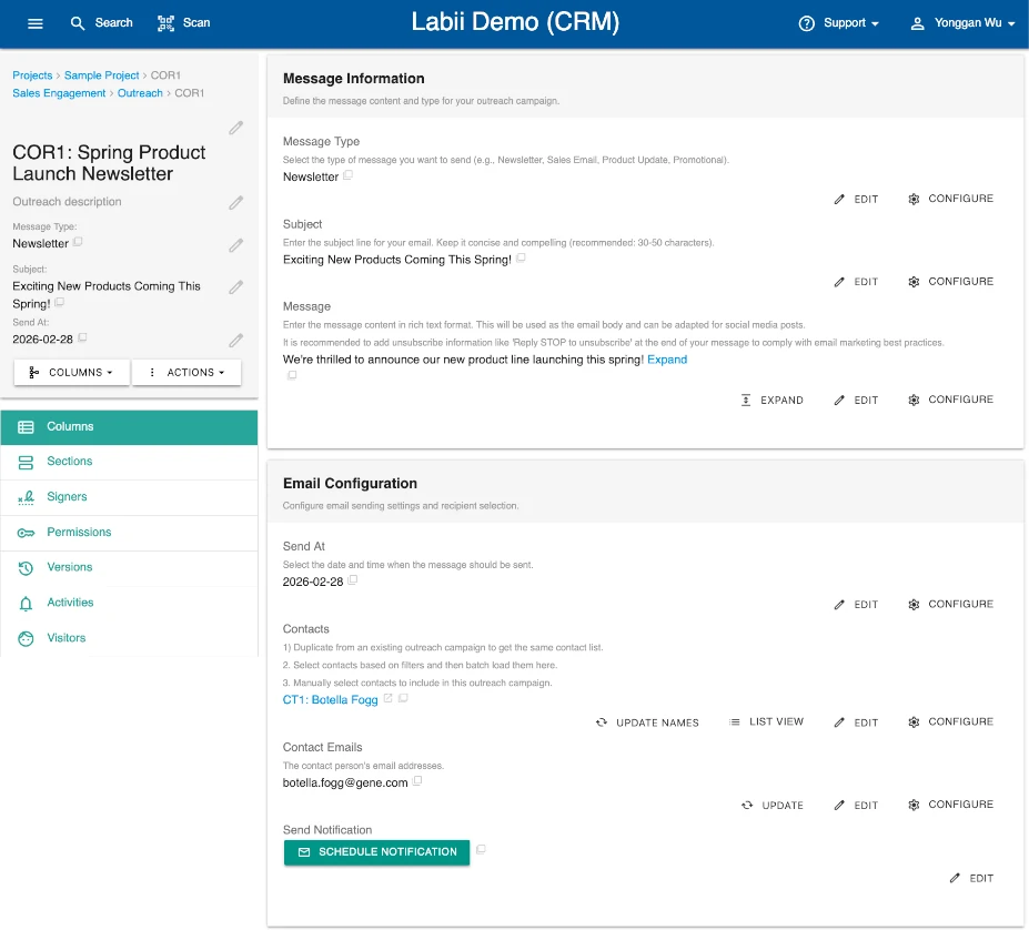 Labii Sales Engagement is natively built into Labii CRM, eliminating data silos and manual syncing between systems. Every campaign automatically pulls contact information, company details, and interaction history from your CRM database, while engagement metrics (opens, clicks, replies, bounces) flow back in real-time to update lead scores and activity timelines. Sales teams gain complete visibility into each prospect's journey—from first email sent to deal closed—all within a single platform.